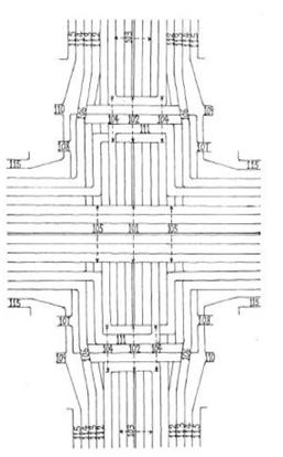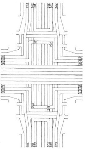 開(kāi)放型人行道115進(jìn)入路口前讓位于電動(dòng)車(chē)道??v向電動(dòng)車(chē)道301人行道302位于兩端路面橋上的橫向掉頭車(chē)道與縱向高架車(chē)道的中間,兩端分別穿越右轉(zhuǎn)彎車(chē)道(高度以電動(dòng)車(chē)行人順利通過(guò)為宜)。人行道出入口107、108跨越電動(dòng)車(chē)道,人行道出入口107-108之間(橫向)為地下通道穿越各縱向車(chē)道(高度以電動(dòng)車(chē)行人順利通過(guò)為宜)。電動(dòng)車(chē)道出入口109-110之間(橫向)為地下通道,穿越人行道入口107、108和各縱向車(chē)道(高度以電動(dòng)車(chē)行人順利通過(guò)為宜)。