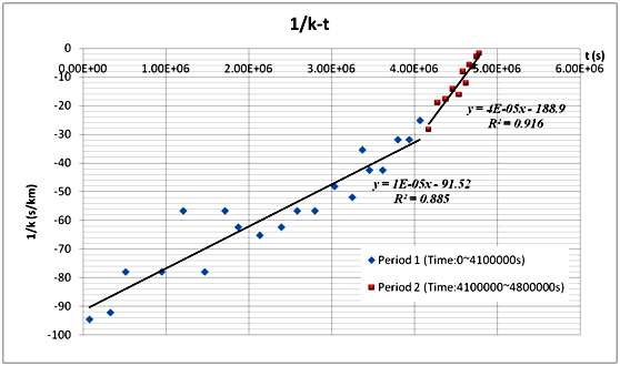 于是, 通過密集地在曲線上取點然后通過Excel軟件錄入并處理其t和 h坐標, 我們可以近似得到曲線在相應點上的切線斜率k. 進一步地, 通過建立k和1/t之間的線性回歸模型, 我們可以解決出A和B. 并通過求估計高度與實際高度的差的平均值, 我們可以得C. 綜上我們可以得到以下的密度-高度模型: