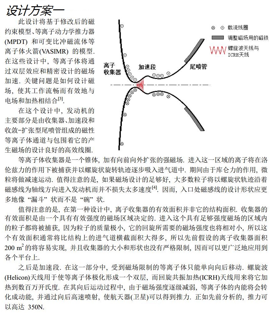 這一事實讓我想起了使用的離子推進器的衛星, 如SMART和DAWN衛星等. 離子推進器的廣泛應用說明了人類在短距離小空間內加速離子的技術日臻成熟. 這也同時讓我考慮到一個新的模型——融合傳統離子推進器和沖壓發動機的設計, 讓等離子體代替空氣進入進氣道, 然后使用電場和磁場來加速, 以取代化學燃料的燃燒. 這就是我的想法的概述.