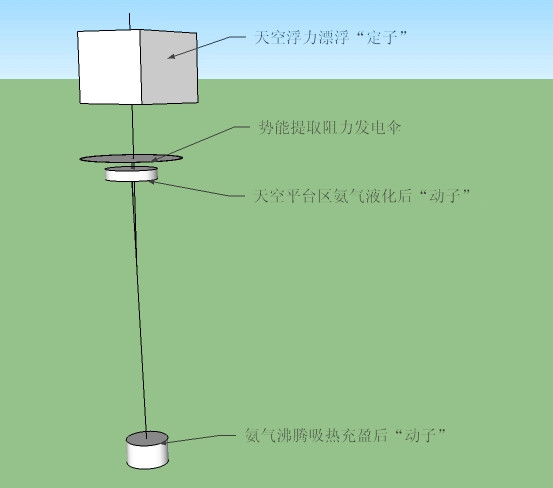 如上圖所示:設(shè)計一種系統(tǒng),在地面的時候“動子”里面的物質(zhì)呈氣態(tài),而且單位體積明顯輕于空氣,就會形成比較大的浮力,使“動子”具有上升的趨勢,放開“動子”任其在浮力下,自由上升,當(dāng)上升到一定高度后,“動子”內(nèi)的氣體由于溫度明顯下降而液化成液體,這時浮力消失,“動子”在重力作用下會快速下落。這就形成了一個利用熱能、勢能、動能之間相互轉(zhuǎn)化而形成的一個“永動系統(tǒng)”而且能從外界獲取可觀能源來發(fā)電。只要做出“動子”上升時保溫,上升到一定高度后能自由撤銷保溫狀態(tài)進行熱交換就可以了。