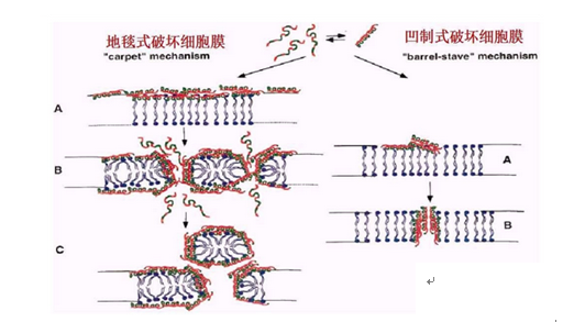 防御素抗菌的作用機理,目前有兩種不同的抗菌作用機理被提出,一種是獨立膜機制,另一種是防御素結合細胞內復合物的機制。獨立膜機制的觀點認為, 帶正電荷的防御素與帶負電荷的細菌細胞膜相互吸引,并相互結合,從而破壞了磷脂雙分子層的完整性,引起靶細胞膜出現裂隙。可分為三個階段:(1)由靜電吸引。防御素與靶細胞膜結合。防御素帶正電荷,可通過靜電作用與帶負電荷的細菌膜脂層結合;(2)通道形成。帶正電荷的防御素分子或其多聚體則與細菌質膜上帶負電荷的磷脂頭部和水分子相互作用,顯著地增加生物膜的通透性。防御素作用于膜上形成穩定的多個通道;(3)內容物外泄。通道形成后,防御素進入細胞內的同時,其他胞外分子也伴隨進入(如肽、蛋白質或無機離子),而靶細胞的重要物質(如鹽離子和大分子)滲出,細胞膜的通透性及細胞能量狀態受到了破壞,導致細胞膜去極化,呼吸作用受到抑制以及細胞ATP含量下降, 離子和大分子物質通過細菌的細胞膜, 最終導致靶細胞死亡。