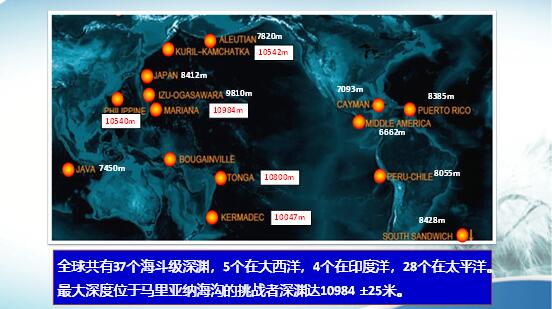 全球海洋深度大于6000米的區域只有1%左右,而海斗深淵卻有37個,有5個在大西洋、4個在印度洋、其它的在太平洋。