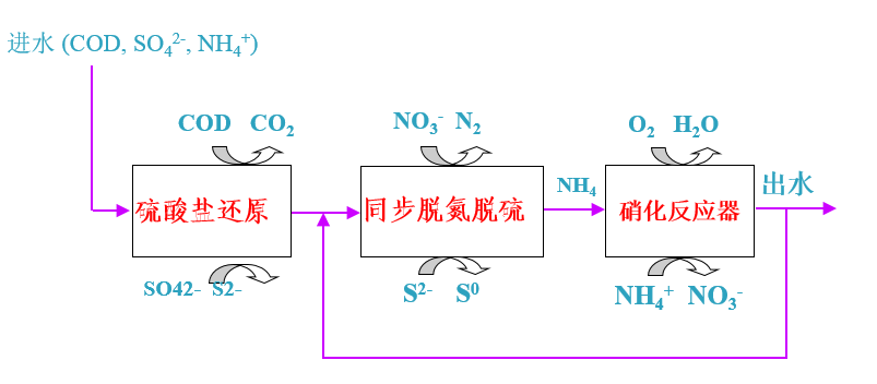 在通常條件下含硫工業廢水中同時含有大量的氮素,高含硫含氮也是制藥生產廢水的另一主要特征。隨著生物脫硫技術與生物脫氮技術的發展,通過研究碳氮硫共代謝體系,硫酸鹽的還原產物的生物氧化過程與含氮污染物反硝化過程,相互間的作用關系,提出了碳氮硫共脫除體系。