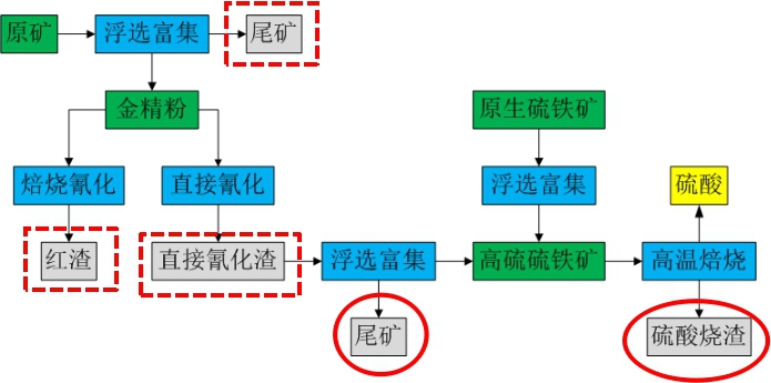 黃金生產(chǎn)過(guò)程的固廢包括浮選尾礦、氰化渣(紅渣和直接氰化渣)(圖3)。可對(duì)金精礦的浮選尾礦進(jìn)行氰化提金或制造建材,對(duì)直接氰化渣進(jìn)行浮選回收有價(jià)元素。