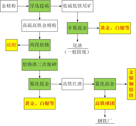 我們提出了黃金未來(lái)發(fā)展的一個(gè)思路。黃金綠色選冶技術(shù)包括以下三個(gè)部分:難選冶金精粉硫鐵富集選、兩段焙燒?氰化提金(含焙燒渣二次脫砷)、高鐵紅渣高值化綜合利用、尾礦非氰提金。終端產(chǎn)品包括金、銀等貴金屬、硫酸、銅、高品質(zhì)煉鋼粒鐵(球團(tuán))等。該流程產(chǎn)業(yè)鏈結(jié)構(gòu)完整,實(shí)現(xiàn)真正意義上的資源循環(huán)利用;綜合回收礦物中的金、銀、銅、鉛、鋅等有色金屬和鐵,各有價(jià)元素的資源化利用得到最大化,避免了資源浪費(fèi);實(shí)現(xiàn)了氰化尾渣的無(wú)害化利用,整個(gè)過(guò)程沒(méi)有危險(xiǎn)固廢產(chǎn)生,廢氣達(dá)標(biāo)排放,水循環(huán)使用無(wú)外排;能夠處理多元素含砷復(fù)雜金精礦,對(duì)原料的適用性強(qiáng)(圖4)。